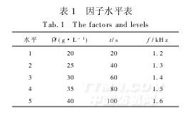 对工艺B进行优化设计。影响试验结果因子有极板间距、等离子处理时间、等离子体处理频率与电压、焙烘温度、焙烘时间。极板间距越小,等离子体照射越均匀,为了减小试验误差,固定极板间距为3mm;根据所使用整理剂说明书,选择焙烘温度150℃,时间2min。确定试验因子为整理剂质量浓度、等离子体处理时间、等离子体处理频率,选取5水平3因子正交试验表为优化分析表,对工艺B进行优化设计。得到因子水平表,如表1所示;根据表1设计正交试验表,如表2所示。