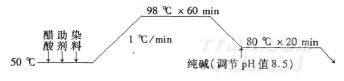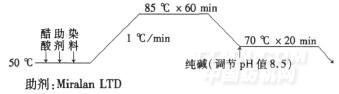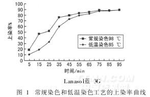 从图1可以看出,采用低温染色工艺,初始上染率明显低于常规染色工艺,相差约10%。但染色55min后,上染率都趋于平衡且基本接近。