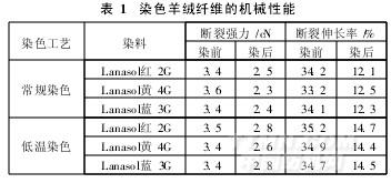 对上述染色样品的机械性能进行测试,研究常规染色工艺和低温染色工艺对羊绒纤维断裂强力和断裂伸长率的影响,结果见表1。