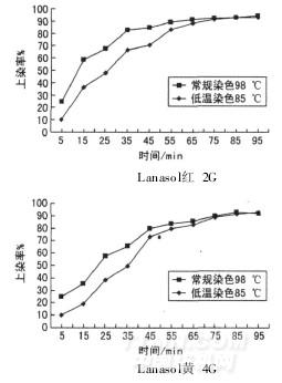 对lanasol红2G,黄4G,蓝3G染料分别按1.2.1节和1.2.2节工艺进行平行试验,测试染色过程中不同时间的染液吸光度,计算上染百分率,并绘制上染曲线,比较常规染色和低温染色工艺的上染率,结果见图1。