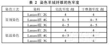 两种工艺的染色皂洗牢度和干摩擦牢度见表2。