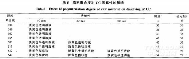分别选择了棉浆粕(聚合度为517)和木浆粕(聚合度为520)作原料,合成含氮量为2.75%的CC,在相同条件下作溶解实验,结果发现二者都可形成淡黄色透明溶液,且溶解速度相当。