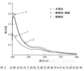 多酚类化合物由于酚羟基的存在,加入相应的诊断试剂后,UV-VIS光谱会发生变化,这种性质可用于判断化合物的结构及羟基所在的位置。诊断试剂一般为弱碱或金属盐,加入弱碱可使酚羟基离解形成负氧离子,增大共轭系统的电子云密度,使紫外光谱红移,酸的存在会缓解酚羟基的离解,从而使紫外光谱红移幅度减小。由于酚羟基被氧化成共轭羰基,缩合单宁氧化成的醌类物质的紫外光谱在弱碱的作用下不会产生以上变化。加入诊断试剂后棕色棉色素的紫外光谱变化情况如图2所示。由图可知,棕色棉色素的E2带和B带吸收峰分别在200nm和275nm处,加入醋酸钠后吸收带分别红移至203nm和279nm,而向色素水溶液中滴加醋酸钠/硼酸后测得的2个吸收带分别位于203nm和276nm处。对比向色素溶液滴加醋酸钠后扫描的结果,红移幅度减小。诊断结果表明色素分子苯环上的酚羟基是存在的,棕色棉色素主要成分不是缩合单宁氧化成的醌类物质。相关著作记载,植物体内的单宁类化合物是不稳定的,在氧气和多酚氧化酶的作用下会被氧化成苯醌类化合物,苯醌类化合物也很不稳定,容易被其他物质中的氢还原,特别是具有邻二酚羟基结构的单宁类,被氧化成邻苯醌后,遇到自身的氧化前体(或含氢的溶剂)可在短时间内被还原。若邻二酚羟基处于B环上,氧化而成的邻苯醌与自身的氧化前体反应时,除了被还原成前体外,还有对苯醌生成。对苯醌较稳定,不易被还原成酚类,所以,棕色棉色素的主要成分是缩合单宁类,可能含有少量的缩合单宁氧化而成的苯醌类化合物。