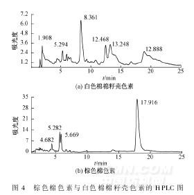 棕色棉色素与白色棉棉籽壳色素的HPLC分离结果如图4所示。由图可知,白色棉棉籽壳色素提取物所含成分较多,其中保留时间为8.361min的组分含量较高。天然棕色棉色素提取物主要含有4种成分,其中保留时间分别为5.282、5.669min的组分未完全分离,可能是其分子结构十分相似的缘故,其HPLC分离条件也需进一步摸索。保留时间为17.916min的组分在棕色棉色素混合物中占有相当大的比例,而且分离度很高。虽然2种色素为同一类化合物,但从它们的HPLC色谱图可看出,天然棕色棉色素和白色棉棉籽壳色素并没有分子结构完全一致的组分。