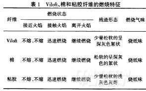 燃烧法利用各种纤维的化学组成不同其燃烧特征差异来鉴别纤维的种类.具体方法是取—小束(质量50~100mg)纤维试样着火燃烧,仔细观察纤维燃烧特征和残渣的形态、颜色、软硬程度,同时嗅其产生烟雾的气味等.Vilofl纤维和棉、粘胶纤维的燃烧特征如表1所示.