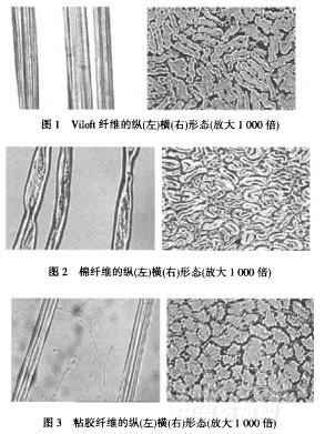 纵向制片:将纤维手扯伸直平行,抽取少量置于载玻片上滞i上少量液体石蜡,覆上盖玻片,在显微镜下观察纤维纵向形态;截面制片:将整理好的适量纤维嵌于哈氏切片器凹槽中,加入少量胶棉液,使其充分渗透到各根纤维间,再压紧纤维,然后用单面刀片切取10~30um的薄片,在显微镜下观察纤维横截面形态.考虑到鉴别方法的实用性,本文使用纤维细度仪观察并采集了Viloft纤维和棉、粘胶纤维的纵、横向形态特征图,结果见图1—3.