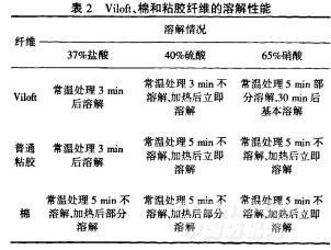 溶解法根据纤维化学组成不同,在不同浓度的化学溶剂中、不同温度下的溶解状态不同(如立即溶解、溶解、部分溶解、微溶或不溶解等)鉴别纤维.本文按FZ/T0105714—2007《纺织纤维鉴别试验方法溶解性试验方法》,选择了3种化学试剂对Vilofl纤维进行溶解性试验,并与棉、粘胶纤维进行了比较,结果见表2.