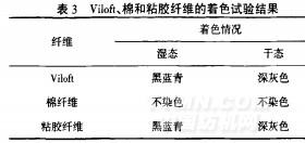 由表3可知,Vilofl纤维用碘一碘化钾溶液着色后,湿态呈黑蓝青、干态呈深灰色,与粘胶纤维基本相同,而棉纤维湿态和干态均不染色.因此,用碘一碘化钾溶液着色可区分棉与Vilofi纤维,但不能区分Viloft纤维和粘胶纤维.