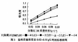 以染料质量浓度[将原始染液(分散红3B0.2g/L、NNOlg/L、pH5)用水稀释而成,没有加入DMF]为横坐标,染液与DMF按一定体积比混合后所测得的吸光度为纵坐标作图,结果如图3、4所示.然后用Origin软件对图3、4中各标准曲线进行线性拟合,各标准曲线的直线相关系数见表3.