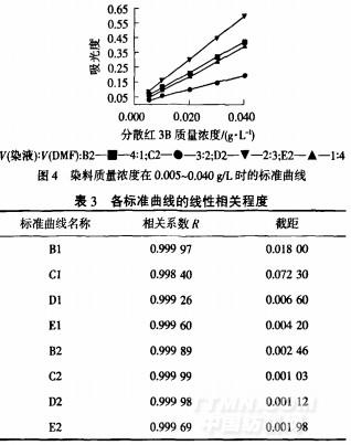 图4染料质量浓度在0.005~0.040g/L时的标准曲线从表3中的R值可以看出,采用DMF溶剂法进行测试,各标准曲线的线性相关性都比较好.但如果精度要求高,还是要将染色原液用水稀释至接近染色残液的质量浓度,再与溶剂混合测吸光度.另外,与丙酮作溶剂时相似,在染液与DMF体积比为4:1时,尽管染料质量浓度高,但所测的吸光度值反而很低.