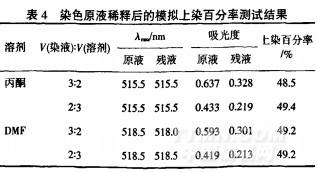 把配制的0.2g/L染液用水稀释至0.04g/L作染色原液,再将该染液用水稀释一倍作染色残液,即理论上染百分率为50%.将染色原液与残液分别按照一定体积比加入丙酮或DMF后,再用紫外分光光度计测试吸光度,按公式计算上染百分率,结果见表4.