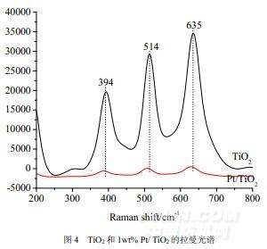 在对比实验中发现TiO2纳米颗粒负载贵金属Pt之后能显著提高其催化活性。采用拉曼光谱对Pt/TiO2的结构进行了考察,结果如图4所示。负载金属Pt后的催化剂与空白载体TiO2的拉曼光谱峰形在200~800cm-1范围内基本一致,都出现了锐钛矿晶型TiO2的三个特征拉曼吸收峰,但是负载Pt后,二氧化钛的拉曼光谱的吸收峰强度大大减小,同时谱峰也出现了向低波数方向移动的趋势,三个特征吸收峰的峰位分别从394cm-1、514cm-1和635cm-1移到了387cm-1、508cm-1和629cm-1,其原因可能是由于Pt的负载,使得TiO2纳米颗粒产生晶格缺陷,致使表面原子缺少相邻原子而处于相对松弛状态、表面氧空位增加,最终表现为催化活性的提高。类似的现象在文献中也出现过。
