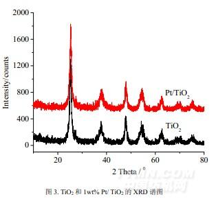 采用XRD对负载Pt前后的催化剂进行表征,结果如图3所示。两者的XRD谱图基本相同,表明Pt的负载没有改变TiO2的晶相结构,都是锐钛矿晶型结构。此外,谱图中没有发现金属Pt的任何晶相峰,说明金属组分Pt在载体表面获得了很好的分散,与TEM表征结果一致。活性金属组分在载体上的分散度对催化剂的性能有密切的联系。实验中Pt在TiO2上得到很好的分散,可能是催化剂具有良好效果的原因之一。