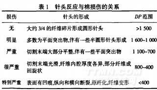 通过显微镜可快速测试棉的化学损伤并估计损伤的程度.用锋利的尖刀或刀片将测试纤维切割成大约1mm的碎片,然后放到含15%氢氧化钠的载玻片上,用盖玻片加盖2—3min,最后测试在切割末端形成的针尖.在未损伤棉中初生胞壁完整无缺,因此,次生胞壁内的纤维在氢氧化钠溶液中剧烈溶胀,纤维在切割末端紧压形成针尖状.化学损伤纤维由于初生胞壁受到破坏,纤维可以无限溶胀,因此,不能形成针尖状.经过交联免烫整理的棉只发生稍微溶胀,不能形成针尖,据此可知纤维受到较大的化学损伤.针尖反应适合于棉纤维的各个加工和整理阶段,但是对亚麻或苎麻则不适用. [2]174-17590%以上的纤维素交联剂含有甲醛,因而可用铬变酸测试织物上的甲醛来进一步验证针尖反应的准确性:少量纤维在1~2mL 72%的硫酸中加热到最高温度(100℃),其中100mL硫酸溶液中含10g铬变酸.如果l~2min后有红紫色形成则表示有甲醛存在.针头反应与棉损伤的关系见表1.