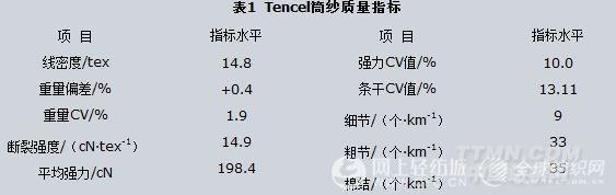 通过上述工艺流程及各工序工艺设计及技术设施,Tencel成纱质量良好,各项指标如表1。
