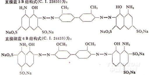 )为偶氮成分的燃料,其颜色均比联苯胺结构的深,而以联邻甲氧胺比联甲苯胺更深些,如直接湖蓝6B就比直接蓝3B深。