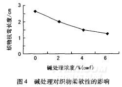 由于碱处理使涤纶纤维减量变细,因此处理后织物会变柔软。不同碱浓处理织物的柔软性能见图4。