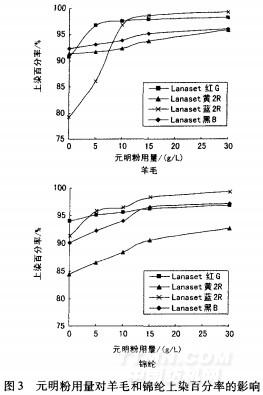 从图3可以看出,元明粉用量在0—15g/L时,4只染料的上染百分率均随元明粉用量的增加逐渐增大;元明粉用量超过l5L后,染料的上染百分率基本不变。在中性浴中染色,染浴pH值高于羊毛和锦