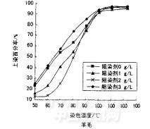 在不加阻染剂条件下,羊毛和锦纶纤维分别按1.2节工艺进行染色,测定不同元明粉用量时的上染百分率,结果见图3。