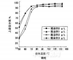 图4显示,阻染剂FK-450A的加人,降低了染色初期羊毛和锦纶的上染百分率,但并不影响染料的最终上染百分率。随着阻染剂用量的增加,锦纶的初染率降低得更多些,即阻染剂对锦纶的阻染作用更明显。染料Lanaset黄2R,Lanaset蓝2R及Lanaset黑B的规律,亦与Lanaset红G基本相似。