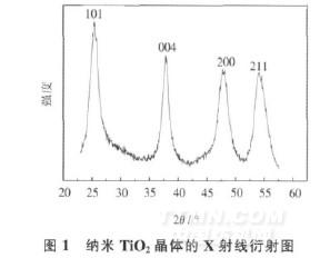 TiO2有3种晶型,即板钛矿、锐钛矿和金红石.具有紫外激活效应的主要是锐钛矿和金红石,其中锐钛矿为低温晶型,金红石为高温晶型.从紫外光催化激活效应角度讲,锐钛矿比金红石性能更好,催化活性更高[7].烘干整理剂得到的纳米TiO2晶体的X射线衍射图如图1所示.