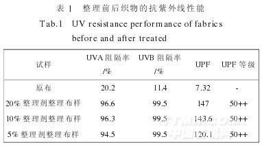 2.4.这说明当整理剂质量分数增大时,虽然整理织物的UPF值也增大,但增大的幅度有所降低,UPF值达到相对稳定状态.当整理剂质量分数达到10%时,整理织物的UPF值达到140以上,这说明此时织物已经具有比较理想的抗紫外线性能.