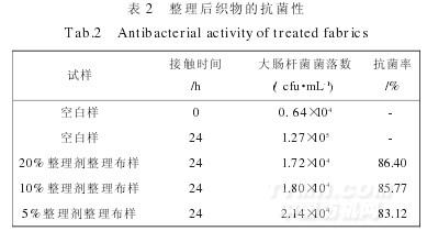 经不同质量分数(20%、10%和5%)纳米TiO2整理剂整理后织物的抗菌性见表2.