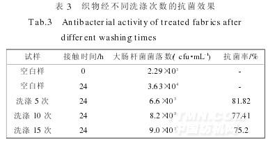 为了评价抗菌效果的持久性,将10%整理剂整理的织物分别洗涤5次、10次和15次后,其抗菌效果如表3所示.