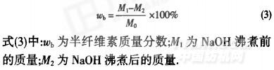 式(3)中:姚为半纤维素质量分数;M。为NaOH沸煮前的质量;M2为NaOH沸煮后的质量.