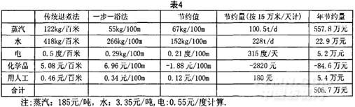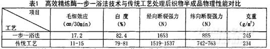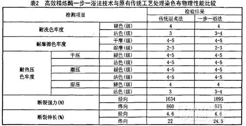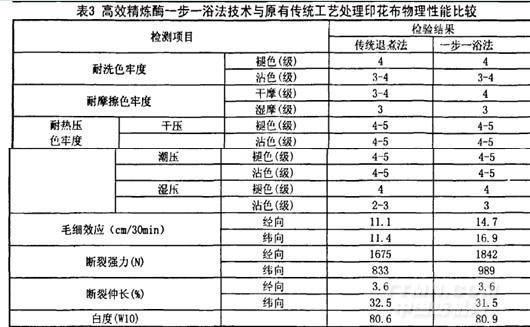 与传统前处理工艺的产品对比。对比发现,用高效精炼酶一步一浴法技术处理的布经染色或印花,布面丰满平整,色牢度和断裂强力等各项物理性能指标均与常规工艺相媲美。其对比结果如下: