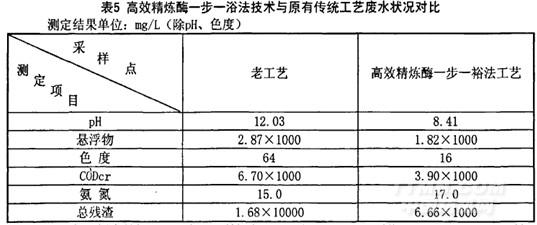 由表5可知,用高效精炼酶技术处理所得废水的色度、pI{值、悬浮物含量、CODcr、生化需氧量BOD5和总残渣量均较传统工艺的低,这就确保了高效精炼酶一步一浴法技术实现清洁生产的可行性。