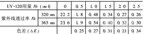 紫外线整理剂染色的织物为标准,测定加入不同用量UV-120后染色织物的色差值,考察防紫外线整理UV-120对色光的影响,结果见表1。