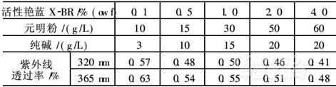 染料0.5%,元明粉15g/L,纯碱10g/L,防紫外线整理剂UV-120的用量分别为0、0.5%、1.0%、1.5%、2.0%、2.5%。采用上述工艺条件对织物进行处理,试整理后织物的防紫外效果,结果见表1。以不加防