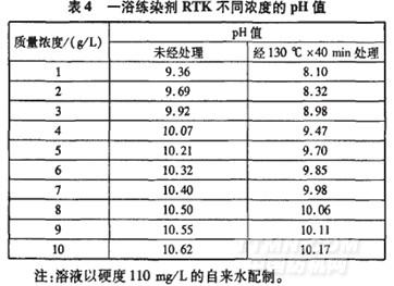 —浴练染剂RTK不同浓度的pH值变化情况见表4。