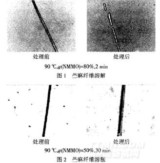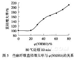 由图5可知,当φ(NMMO)=30%~80%时,苎麻纤维有溶胀现象;8O%时,溶液对苎麻纤维的溶胀作用最大(90%的水溶液难以配制),达到210%.随着体积分数的降低,纤维直径增大率逐渐下降.当q~(NMMO)≤20%时,其溶胀增大率与水溶液基本一致,达到100%.