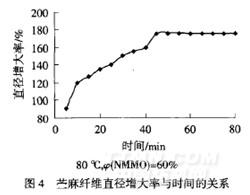 由图4可知,处理5min后,直径增大率只有90%;随着处理时间的延长,直径增大率逐渐上升;45minH~达到最大值,175%;再延长处理时间,直径增大率的最大值并没有改变.另外,在开始阶段苎麻纤维的溶胀速度比后期快.