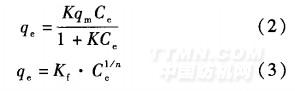 苯酚吸附等温线分别用Langmuir模型(2)和Freundlich模型(3)描述: