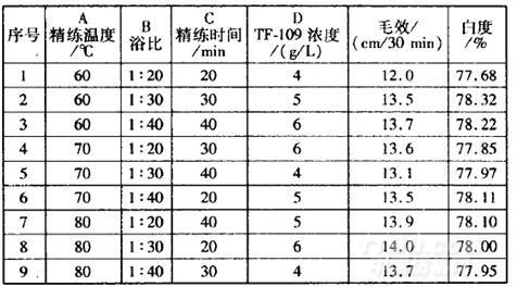 109质量浓度>精练温度>浴比和精练时间。优选方案为A3B3C2D3,即TF一109质量浓度6g,/L,浴比l:40,精练温度8O℃,处理时间30min。影响织物白度的主次顺序为:TF一109质量浓度>浴比和精练时间>精练
