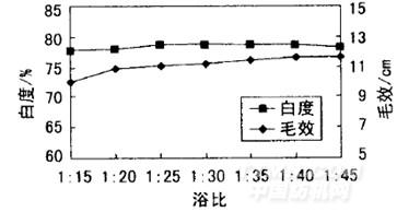 由图7可知,浴比从1:15提高至1:20,对毛效的提高作用较明显。此后继续提高浴比,毛效变化不大。从白度变化曲线看,其受浴比变化的影响很小。