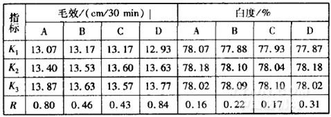温度。优选方案为A2B2C3D2,即TF一109质量浓度5g/L,浴比1:30,精练温度7O℃,精练时间40min。由此可知,TF.109质量浓度对织物的毛效和白度影响均较大。权衡两个指标,最终确定A3B2C2D3,为优化方案,即TF一109质量浓度6g/L,精练温度为80℃,时间30min,浴比为1:30,此时毛效最高,白度值由78.32降为78.00,损失相对不大。