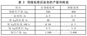 从表3可知,汽蒸预缩处理后每千克纱染色用水量可减少37.5%﹑用电减少40%﹑蒸汽减少37.5%,而每天的产量可提高60%。