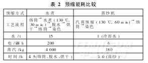 3.3 纱力拉预缩工艺与水煮预缩工艺能耗比较以预缩1000kg涤纶长丝为例,对纱力拉预缩工艺与水煮预缩工艺的能耗进行比较,见表2。