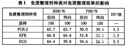 按1.2节免烫整理工艺,试验经不同免烫整理剂(PCR-2、EFR和ECO)整理后织物的免烫效果和织物的损伤,测定的结果见表1。