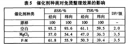 选择MgCl2和F-M2种催化剂,按“1.2节免烫整理工艺”试验,研究不同催化剂的免烫整理效果,结果见表5。