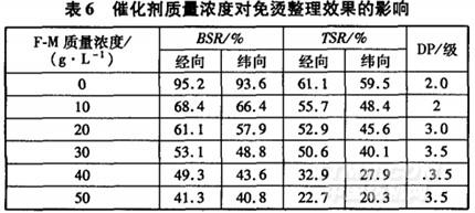 按“1.2节免烫整理工艺”,改变催化剂F-M质量浓度,织物经整理后的性能见表6。
