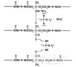 用适量去离子水溶解上述单体NPAZ,配制成不同质量浓度的水溶液,并与不同质量的阴离子水性聚氨酯混合,搅拌均匀,并维持混合体系pH值为8~9,即制得一系列不同浓度的架桥型水性聚氨酯阻燃整理剂。该体系中,NPAZ与阴离子水性聚氨酯在8O℃条件下,即可引发架桥反应,反应式如下: