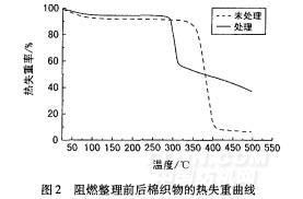 阻燃单体设定NPAZ25%,水性聚氨酯15%,JFC0.5%,160℃焙烘3min,棉织物阻燃整理前后的热失重曲线如图2所示。