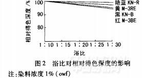 从图2可看出,浴比在1:10—1:30内,得色深度的变化一般不超过5%(活性艳蓝KN—R影响最小,活性红M一3BE影响较明显)。由此可见,M型、KN型活性染料,在酸性沸染条件下染锦纶中浅色时,由于脚的吸尽率高,浴比的大小对染色深度的影响较小,但需注意对拼色色光的影响。