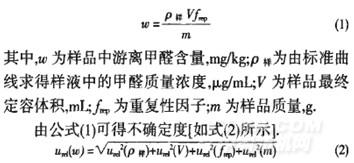 高效液相色谱法测定纺织品游离甲醛含量时,影响不确定度的主要因素有:(1)标准使用液的不确定度;(2)标准曲线的不确定度;(3)样品处理的不确定度;(4)测试方法重复性的不确定度.