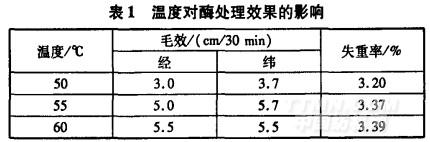 表1中,处理温度为55℃和60℃时,汗布的失重率和毛效接近,与文献[1]中酶活最佳温度范围相符。考虑到生产中加料温度一般控制在50-55℃,并且需要蒸汽加热,为防止局部加热导致酶失活,酶处理温度选用55℃。